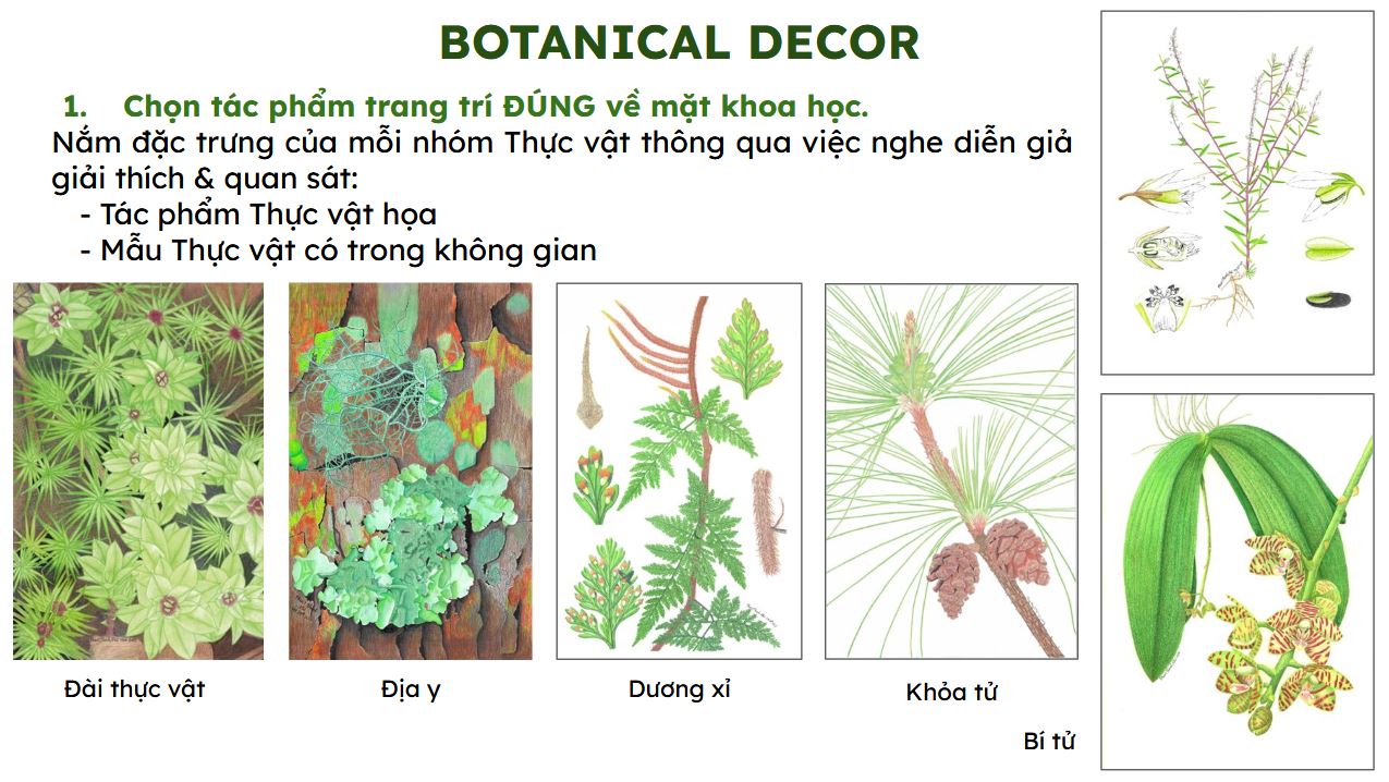 Buổi chia sẻ được mở đầu với phần trình bày của Thanh Nhã về “Thực vật họa”, tập trung vào các nguyên tắc cơ bản và những yếu tố cần cân nhắc khi lựa chọn các tác phẩm thực vật họa để bố trí trong không gian.